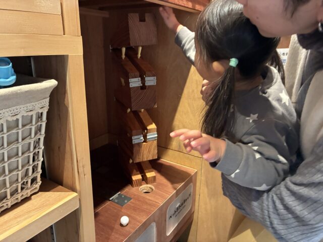 この5品目を、どうしたら楽しく回収できるか。まずペットボトルキャップは、コロコロ転がせるな、と最初に思いつきました。ビー玉転がしのようにはうまく転がらず、試行錯誤しましたが、最終的には工務店さんが上手に形にしてくれました。