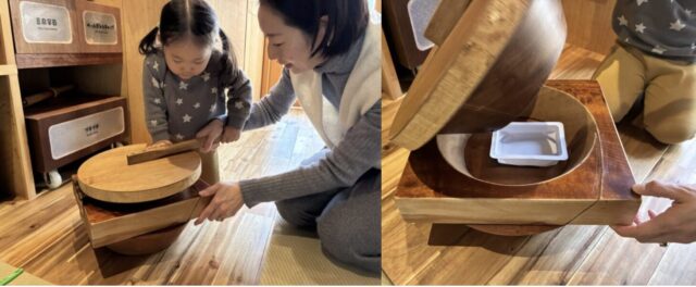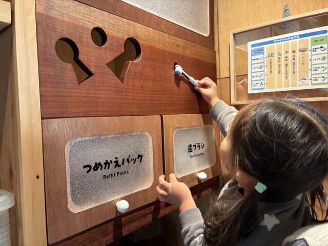 歯ブラシとつめかえパックは、形合わせのような穴から入れることで、回収ボックスに入ります。少し高い位置にあるので、保護者の方が抱っこしてあげてください。