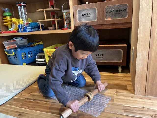 プチプチは、麺棒のような道具でつぶして、音が鳴るのを楽しみます。スケートボードの車輪を使っています。力の入れ具合や角度、速さなどを感じながら、夢中でやってくれる子も。