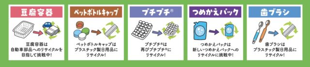 この「エコノバえがお」で回収しているのは、豆腐容器、ペットボトルキャップ、プチプチ、つめかえパック、歯ブラシの5品目です。他のエコノバと同様、洗って、乾かしたものを回収しています。