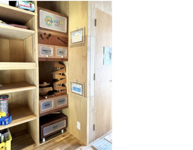 高井さん:壁一面のトイライブラリー(貸出用のおもちゃ)の棚の一角が、エコノバのスペースなのですが、実は幅が60cmしかなくて。最初は大丈夫かな?と思いましたが、秋松さんと工務店さんがうまく収めてくださいました。