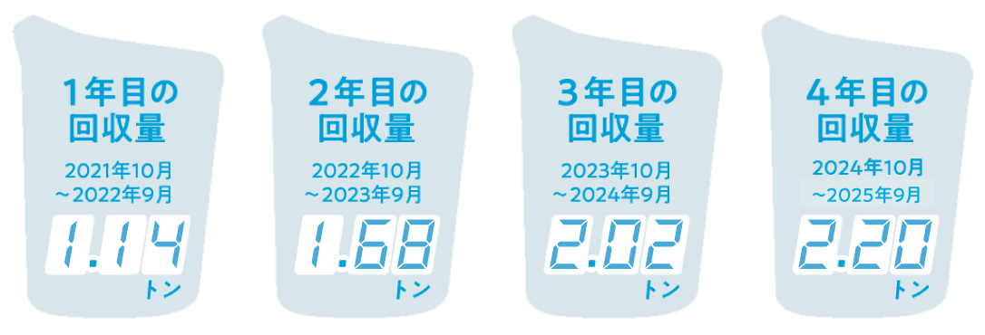 - 目標は初年度5トン/年。(将来目標10トン/年)。市内小売74店舗・エコノバで回収。(全国最大規模)